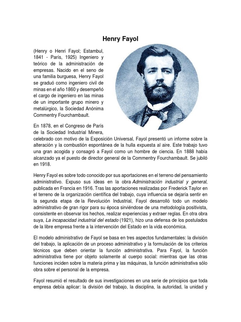 Biografía de Henry Fayol Destacado ingeniero civil que impondría un modelo administrativo conocido como fayolismo y que está considerado en la historia como un pionero de la administración de empresas. Su teoría de la administración científica constituye la base de la administración de empresas y la gestión empresarial. Henri Fayol Henri Fayol 1841- 1925 fue un ingeniero de minas francés director de minas y moderno teórico de la administración. Henry Ford Henry Ford nació el 30 de julio de 1863 en una granja cerca de Dearborn Michigan. Henry Fayol o Henri Fayol 29 de julio de 1841 19 de noviembre de 1925 Ingeniero y teórico de la administración de empresas. Estudió ingeniería civil de minas y culminó en el año 1860.