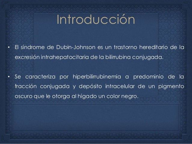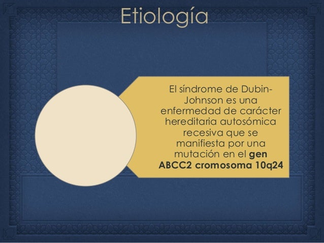 Enfermedad autosómica recesiva caracterizada por ictericia. El síndrome de Dubin-Johnson es una enfermedad rara caracterizada por un aumento generalmente leve de la bilirrubina conjugada en sangre bilirrubina directa. El Síndrome de Dubin-Johnson SDJ es un trastorno genético poco común. La mortalité fœtale ne semble pas majorée. El síndrome de Dubin-Johnson SDJ es una enfermedad hepática hereditaria benigna caracterizada desde el punto de vista clínico por una hiperbilirrubinemia crónica predominantemente conjugada y desde el punto de vista histopatológico por depósitos de pigmentos de color marrón-negruzco en las células parenquimales hepáticas. Se acumula un pigmento oscuro en.