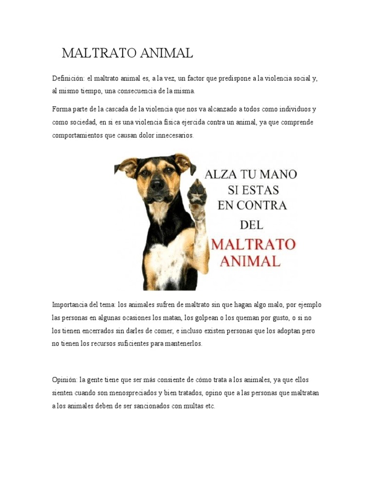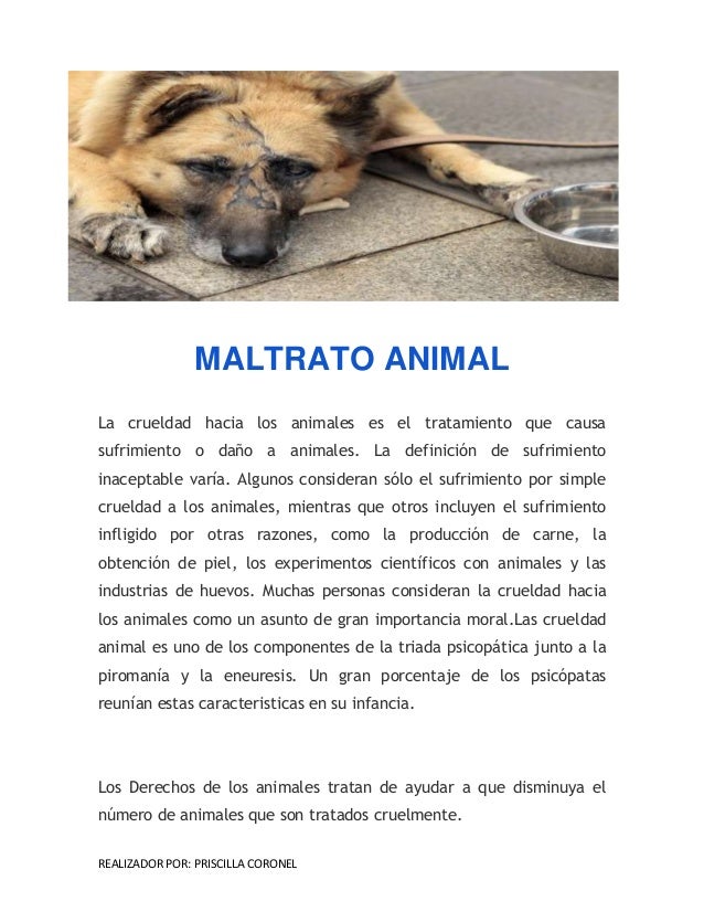 Resumen del maltrato animal. La crueldad hacia los animales también llamada crueldad animal abuso animal o maltrato animal comprende comportamientos que causan dolor innecesario o estrés a los animales no humanos. El maltrato animal es definido como un comportamiento irracional de una persona hacia un animal con el objetivo de causarle sufrimiento estrés o incluso puede llevarlo a la muerte. Esto lo hacen individuos que han elegido tener un animal en su casa. El maltrato hacia los animales constituye un aviso sobre la posible existencia de otras formas de violencia. El maltrato animal maltrato físico tortura descuido golpes etc primero que nada recordemos que los animales son seres vivos que tienen nervios al igual que nosotros cualquier cosa que le suceda ellos la perciben de la misma manera que nosotros. La inclusión de un filtro con una pregunta acerca del maltrato animal en una línea telefónica de asistencia en casos de violencia doméstica resultó en una disminución del 80 de los homicidios de.