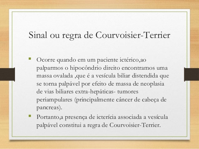 O sinal de Courvoisier é um sinal médico que define a presença de icterícia e de uma vesícula biliar distendida sem a presença de dor. A colestase provoca prurido e em alguns casos pode surgir diarreia com esteatorréia. Ley de Courvoisier -Terrier Todo Paciente con Ictericia progresiva y vesícula palpable no dolorosa Signo de Bard y Pick tiene un Cáncer de cabeza de páncreas o vía biliar hasta que no se demuestre lo contrario. En medicina el signo de Courvoisier-Terrier indica que en presencia de una vesícula biliar agrandada palpable no dolorosa y acompañada de ictericia leve es poco probable que la causa sea atribuible a los cálculos biliares. Tem caráter progressivo observando-se altas taxas de bilirrubina no soro. Hola mi gente hermosa Cómo les va.