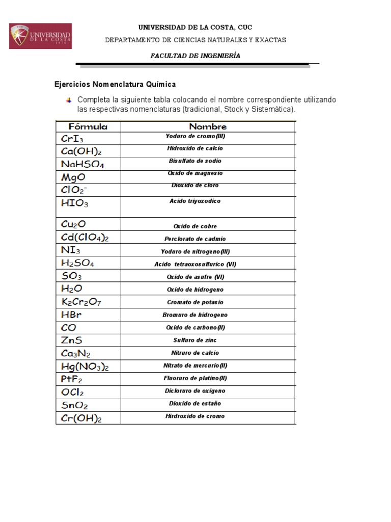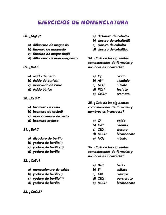 Ejercicios De Formulacion Y Nomenclatura De Quimica Y Inorganica
