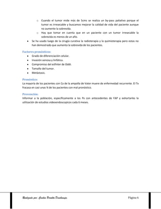 Este cncer se desarrolla en donde el conducto biliar y el conducto pancretico se unen para vaciarse en el duodeno ampolla de Vater. Invade la pared duodenal pero no el pán-creas. Se practicó duodenopancreatectomía cefálica con extirpación del antro gástrico vesícula vía biliar extrahepática distal inmediatamente por encima del confluente hepatocístico duodeno y cabeza del páncreas. El punto en el que se conectan al intestino que se encuentra a mitad de camino en los principales papila duodenal lo largo de la segunda media del duodeno se llama la ampolla de Vater. El conducto colédoco y el conducto pancreático principal generalmente desembocan juntos en la carúncula mayor o papila duodenal mayor esta se encuentra aproximadamente. Se clasifican según su.