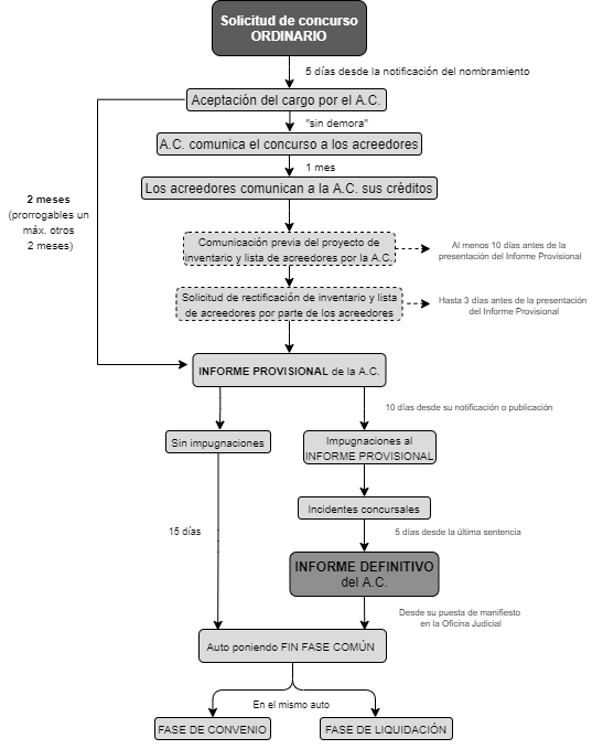 Declaración del concursoSe tomarán si procede medidas cautelares. Las fases del concurso se describen en el artículo 183 de la Ley Concursal. El concurso de acreedores es un procedimiento que se aplica en el caso de que alguna persona jurídica o física no esté en condiciones de pagar a sus acreedores es decir está en condición de insolvencia. Durante la segunda se realiza el convenio de acreedores o la liquidación de la sociedad. Fase común y Fase de convenio o de liquidación aunque las dos últimas pueden ser sucesivas en el tiempo. Fase común La fase común se inicia con la solicitud de declaración del concurso que podrá realizarse por parte del deudor concurso voluntario o por parte de alguno de los acreedores u otras personas legitimadas concurso necesario.