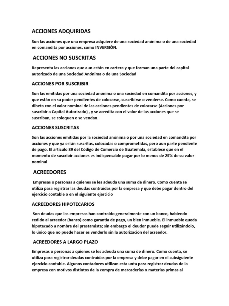 Es cuenta reguladora del capital autorizado. Según el Plan General de Contabilidad 2008 establece que las acciones se valoran por su precio de adquisición a la suscripción o compraEn el precio de adquisición también se incluyen los gastos incluidos en la operación es decir tenemos que tener en cuenta que. CLASIFICACIÓN DE CUENTAS CONTABLES En orden alfabético Resultados Balance General Cuentas Pérdida Ganancia Activo Pasivo Acciones adquiridas X Acciones no suscritas X Acciones por suscribir X Acciones suscritas X Acreedores X Acreedores Hipotecarios X Acreedores a largo plazo X Acreedores por prendas en garantía per contra X Aguinaldos X. De esta forma es el total de capital que los inversores han aportado a la compañía en concepto. Acciones por Suscribir - Acciones no Suscritas. El saldo de la cuenta contable de acciones por suscribir reflejara las acciones autorizadas y no suscritas a la fecha de cierre de los estados financieros.