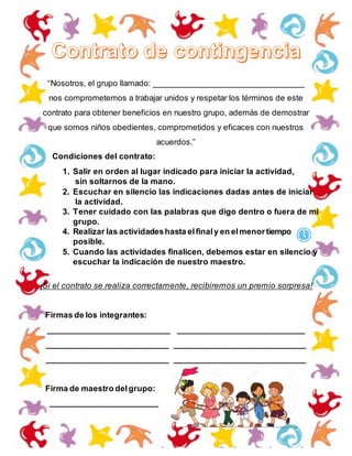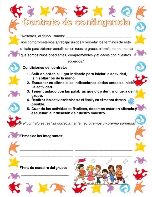 Facultad de Psicología Universidad de Barcelona 15 de junio de 2011 ÍNDICE I. Una de las herramientas de las que nos podemos valer a la hora de Modificar conductas en los niños es el Contrato de contingencias. Los contratos de conducta o contratos de contingencias son una técnica específica para el desarrollo yo disminución de determinadas conductas. En un contrato conductual debe especificarse. En esta fase se determina la respuesta operante deseada y la relación precisa entre la respuesta y el reforzamiento. Contrato De Contingencia Entre Martha Y Daniela Madre E Hija En el siguiente contrato Daniela y Martha se comprometen a.
