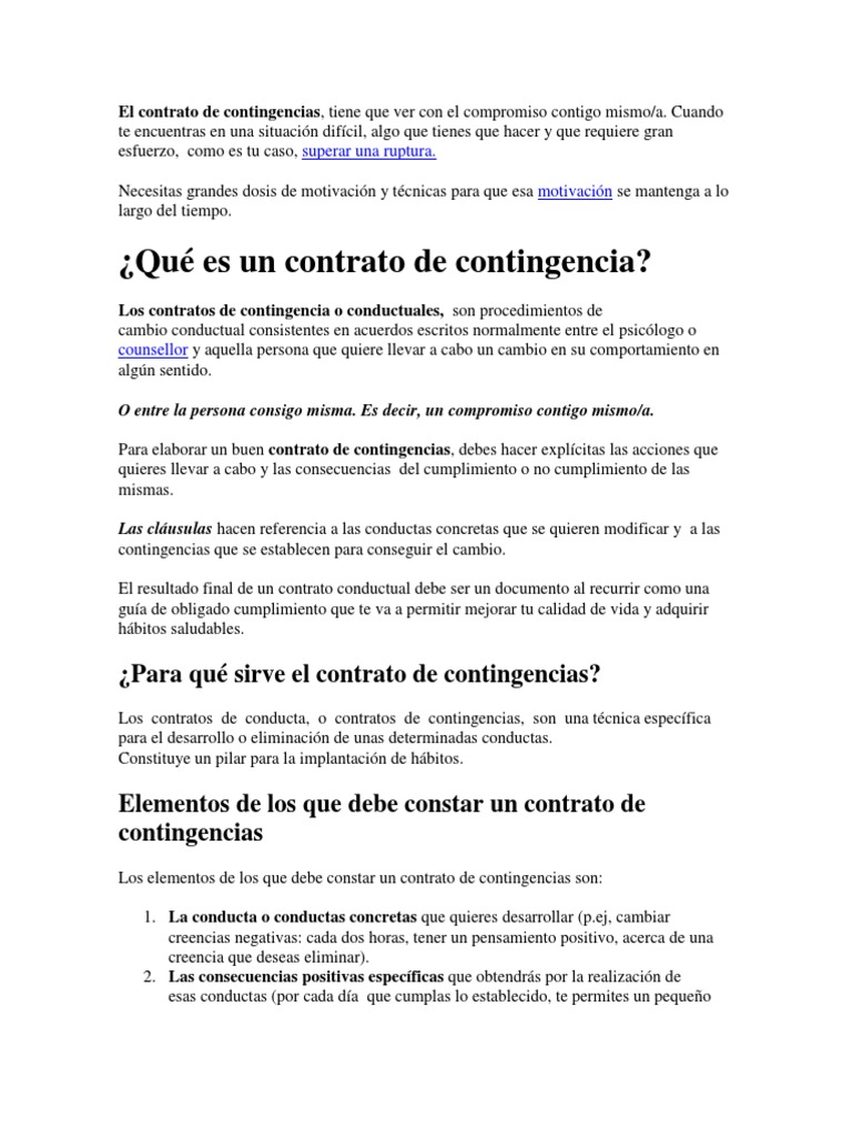 La recompensa debe darse de inmediato una vez cumplido. Se utiliza cuando se pretende reorganizar las contingencias ambientales para modificar respuestas concretas y no se tiene un control tan extenso del medio. Un contrato conductual o de contingencia es una técnica de modificación de la conducta basada en la teoría del condicionamiento operante creada por el psicólogo Burrhus Frederic Skinner. En base a la teoría cognitivo conductual podemos utilizar el contrato de contigencias para modificación de conductas en base a reforzamientos by juank_tapia in Types Instruction manuals y modificación de conductas cognitivo conductual. Los contratos son especialmente útiles en personas con poca capacidad de autocontrol. Anónimo 5 de marzo de 2020 1335.