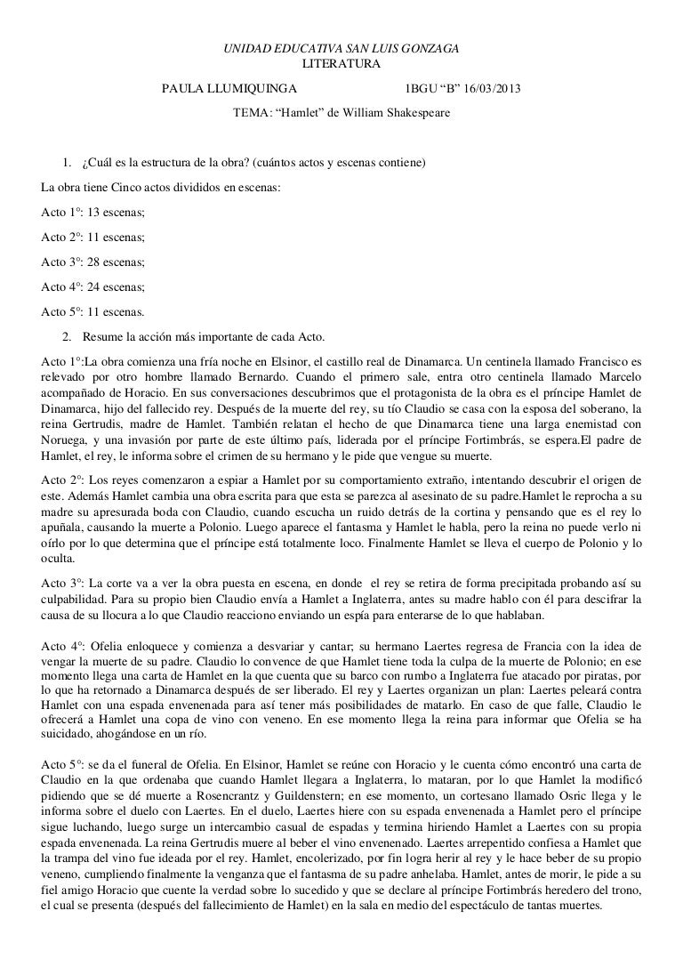2 votes Thanks 2. Capitán De Noruega señor. ACTO IV El cuarto acto se divide en veinticuatro escenas y este al igual que el segundo es un nexo entre el III y el V acto. Menu Skip to content. En qu acto y escena dice Hamlet To be or not to be. Hamlet explica los actos de su tío y dice a su madre que no revele el secreto la cual acepta.