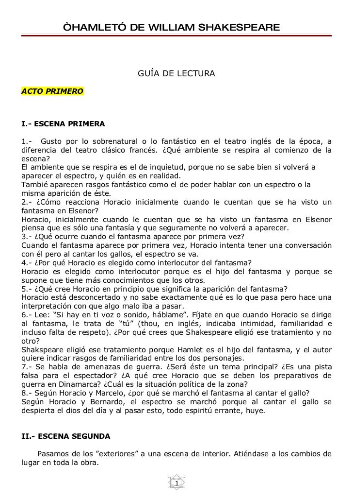 Sabe alguien en que Acto y escena Hamlet dice ser o no ser. Enviado por el rey para. HAMLET RESUMEN POR ESCENAS ACTO 1º ESCENA I Plataforma del castillo. Acto 1 Escena 2 líneas 179-180 Transmitiendo los acontecimientos de las últimas tres noches Horacio le informa a Hamlet que el fantasma silencioso y en armadura de su padre muerto ha sido visto. Los personajes sospechan profundamente unos de otros ya que queda claro que el rey puede haber sido asesinado y nada menos que por su hermano Claudio. Ricardo y Guillermo admiten ante el Rey Claudio que no han podido detectar la causa de la locura de Hamlet.