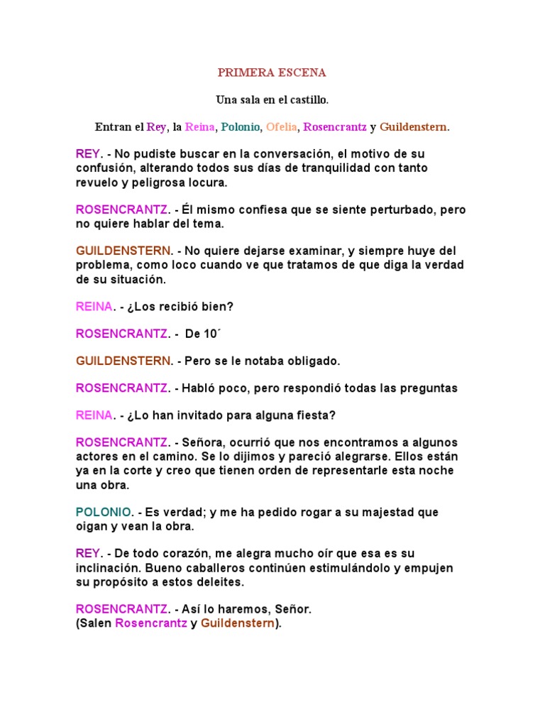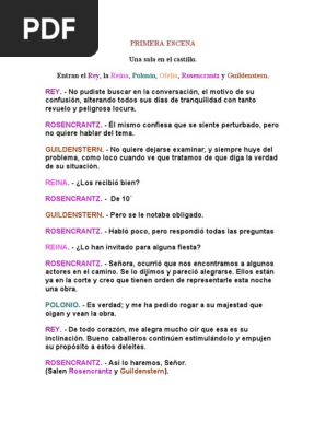 Hamlet Y decidme adónde se encaminan. Noche PERSONAJES Francisco Bernardo Horacio Marcelo SITUACIN Francisco y Bernardo se encuentran en la noche. Sábado 6 de febrero de 2010 Hamlet cuarto acto escenas nueve y diez Tweet Escena nueve UN CAPITÁN HAMLET RICARDO Y GUILLERMO SOLDADOS Hamlet Caballero de dónde son estas tropas. En él tiene lugar el destierro de Hamlet a Inglaterra planeado por el rey a consecuencia de la muerte de Polonio. Hamlet explica los actos de su tío y dice a su madre que no revele el secreto la cual acepta. Hamlet prncipe de Dinamarca.
