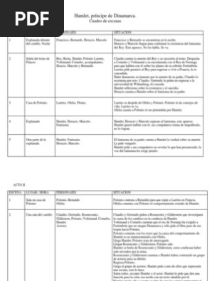 Escenas se anuncia y prepara por medios maravillosos. Hamlet explica los actos de su tío y dice a su madre que no revele el secreto la cual acepta. Cuadro de escenas ACTO I ESCENA 1 LUGAR HORA Explanada delante del castillo. En él tiene lugar el destierro de Hamlet a Inglaterra planeado por el rey a consecuencia de la muerte de Polonio. Cuantas escenas tiene la obra Hamlet. ACTO IV El cuarto acto se divide en veinticuatro escenas y este al igual que el segundo es un nexo entre el III y el V acto.