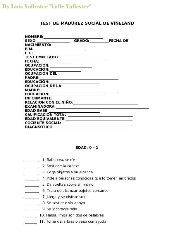 Utilizado en proceso de evaluación de Discapacidad Intelectual. INFORME DE LA ESCALA DE MADURACION SOCIAL DE VINELAND I- DATOS GENERALES. Esta escala ha sido creada por Edgar Doll y la primera formulación apareció en 1935. Esta prueba tiene por objetivo medir el grado de madurez de independencia social a través de 8 sub escalas. Una gran correlación entre la edad de madurez social de la EMSV y la edad mental obtenida con los tests de. Posteriormente se han publicado una serie de trabajos acerca de la utilidad de la Escala dando a conocer resultados experimentales preliminares.