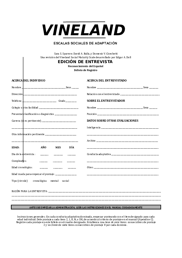 _____ 622 2 19KB Read more. Click to expand document information. 741 3 28KB Read more. Escalas de Comportamento Adaptativo VinelandTerceira Edição O material deste manual está protegido pelas leis de direitos autorais. Las escalas de habilidades de comportamiento adaptativos Vineland 2do edición VinelandII Sparrow Cicchetti Balla 2005 serán utilizadas para evaluar los habilidades personal y social a través de cinco escalas. ESCALA DE MADUREZ SOCIAL DE VINNELAND o Esta escala ha sido creada por Edgar Doll su primera formulación apareció en 1935.