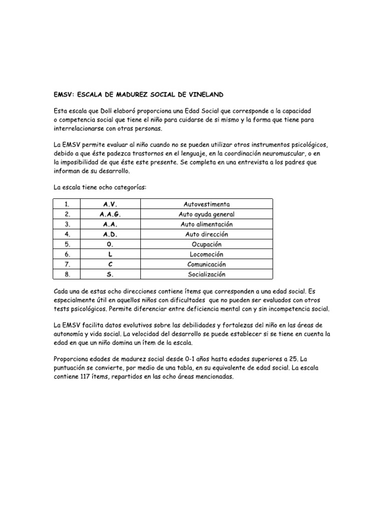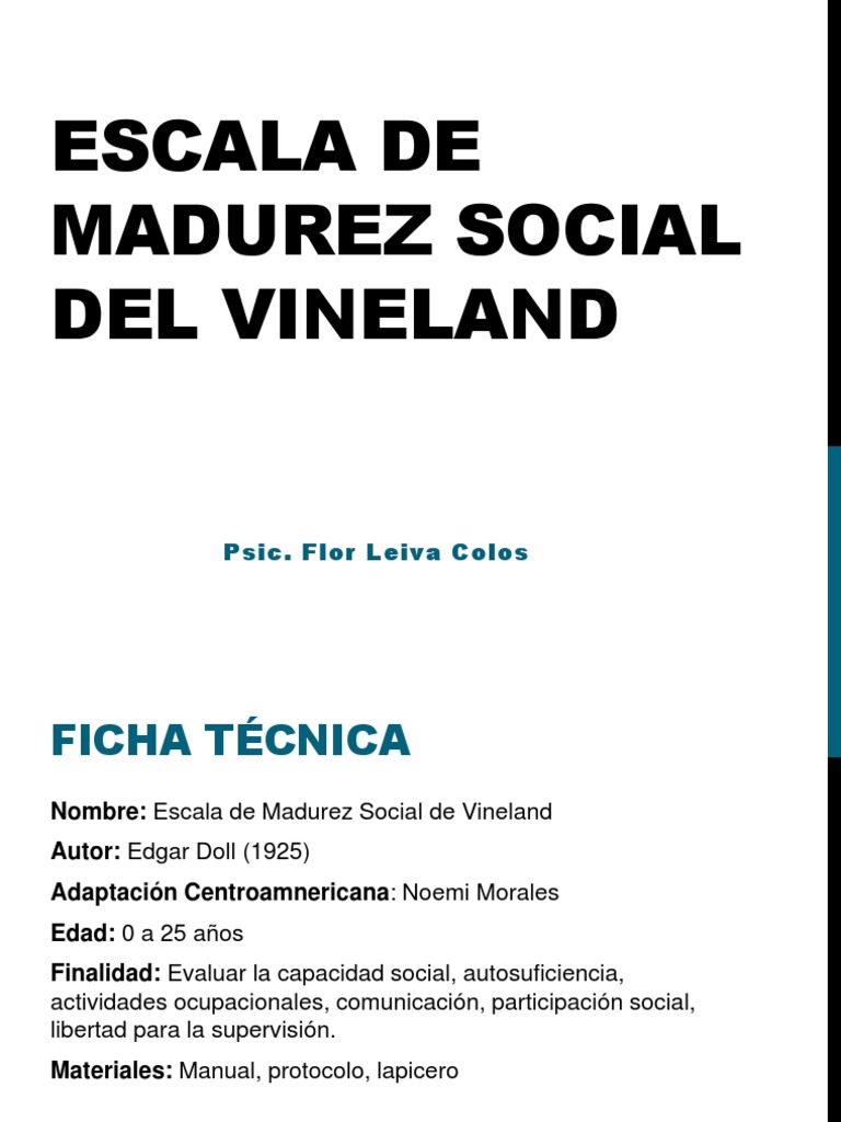 Actualizaciones en Evaluación Psicodiagnóstico Infanto-Juvenil. Su objetivo es determinar la madurez de la independencia social que puede ser considerada como una medida de desarrollo progresiva en la competencia social. 50 2 50 acharam este documento útil 2. Se sugiere descargar también tabla excel para facilitar ingreso y análisis de datos. Cicechetti Una revisioó n del Vineland Social Maturity Scale desarrollado por Edgar A. Puede descargar versiones en PDF de la guía los manuales de usuario y libros electrónicos sobre escala vineland también se puede encontrar y descargar de forma gratuita un manual en línea gratis avisos con principiante e intermedio Descargas de documentación Puede descargar archivos PDF o DOC y PPT acerca escala vineland de forma gratuita pero por favor respeten.