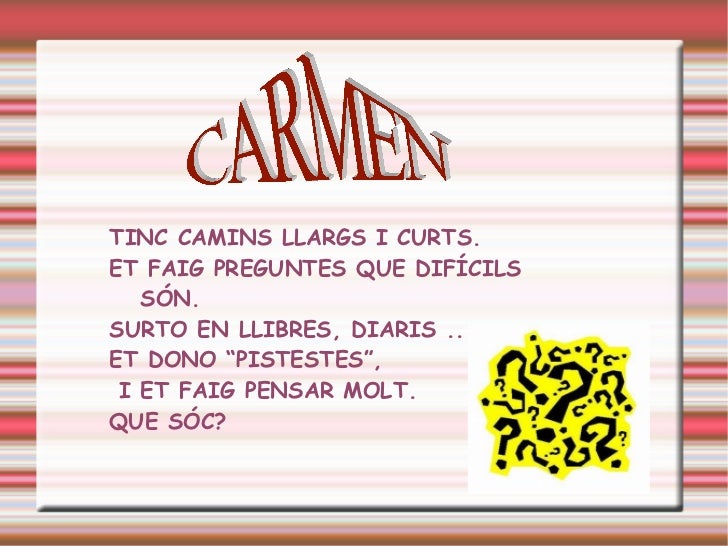 Endevinalles dAnimals en Català. Adivinanzas en catalán endevinalles con respuesta enviadas a Pequenet por los ciberinfantes. Qui és aquella que no està contenta. Dos germans que quan són vellets obren els ullets. I el vestit et pot tacar loli. I em veuràs moltes vegades.