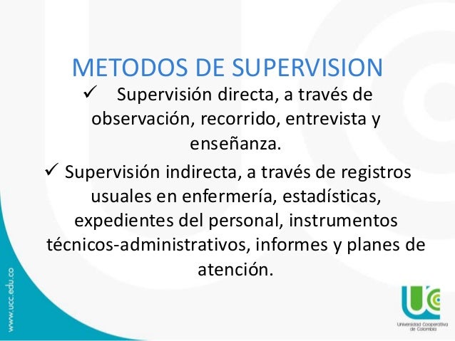 LA SUPERVISION Y EL SUPERVISOR La supervisión es una actividad técnica y especializada que tiene como fin fundamental utilizar racionalmente los factores que le hacen posible la realización de los procesos de trabajo. No designar más de tres responsables por actividadEl área de trabajo del responsable debe facilitar el cumplimiento de la mismaEl perfil técnico del designado debe ser consecuente con la naturaleza de la. MÉTODOS Y MEDIOS DE SUPERVISIÓN EN ENFERMERÍA SUPERVISIÓN INDIRECTA SUPERVISIÓN DIRECTA ES EL MÉTODO EN EL QUE EXISTE CONTACTO DIRECTO CON EL PERSONAL SUPERVISADO Y SUPERVISOR ES EL MÉTODO EN EL QUE NO EXISTE CONTACTO PERSONAL CON EL SUPERVISADO COMUNICACI RECORRIDO OBSERVACIÓ ENTREVISTA. El propósito de de la supervisión en. C- Sepa interpretar adecuadamente los datos recogidos en la observación. El hombre la materia prima los equipos maquinarias herramientas dinero entre otros elementos que en forma directa o indirecta intervienen en la consecución.