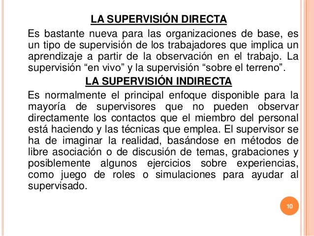 Supervision directa e indirecta. Clasificación de las técnicas y la importancia dentro de la supervisiónSupervisión directaes un tipo de supervisión de los trabajadores que implica un aprendizaje a partir de la observación en el trabajo. CONCEPTO y OBJETIVOS Si acudimos a la Real Academia Española de la Lengua tenemos que supervisión. Perfil de los supervisores. A través de observación recorrido entrevistas y enseñanza. Registro de la supervisión. A través de registros usuales en enfermería estadísticas expedientes de personal instrumentos técnico-administrativos informes y.