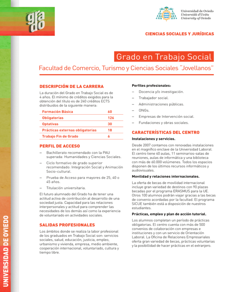 Estudias en Universidad de Oviedo. Fundamentos de Trabajo Social 18 créditos Introducción e Historia del Trabajo Social. Sitio web de la Facultad de Comercio Turismo y Ciencias Sociales Jovellanos de la Universidad de Oviedo que ofrece información relacionada con los estudios sociales trabajo social y de gestión en el ámbito empresarial turístico y de la administración estatal de la Universidad de Oviedo en el Campus de Gijón. En StuDocu encontrarás 235 Practical 138 Lecture notes 36 Summaries y mucho más para. ADMINISTRACIÓN Y DIRECCIÓN DE EMPRESAS. El Grado consta de 240 créditos distribuidos en 60 créditos de Formación Básica 120 créditos Obligatorios 6 créditos del Trabajo Fin de Grado y 54 créditos optativos.