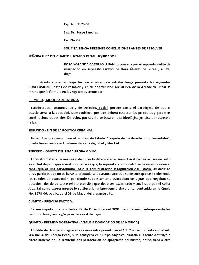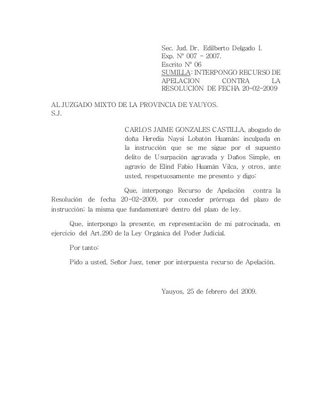 Modelo de escrito del acusador particular interponiendo recurso de apelación contra sentencias dictadas en el procedimiento abreviado por el Juez de lo Penal o Central de lo Penal conforme al art. En los procesos judiciales por el delito de usurpación siguiendo la perspectiva del bien jurídico tutelado no concierne dilucidar la licitud de la posesión sino únicamente si esta ha resultado pacífica. 31 Como prepararse un recurso de apelación. 32 El recurso de apelación es muy utilizado en los inconvenientes legales aunque también se le puede dar uso en otros ámbitos tal como el mercantil laboral educativo o civil. A Usted respetuosamente digo. SEÑOR JUEZ DEL CUARTO JUZGADO PENAL UNIPERSONAL DE LA CORTE SUPERIOR DE JUSTICIA DE LIMA.