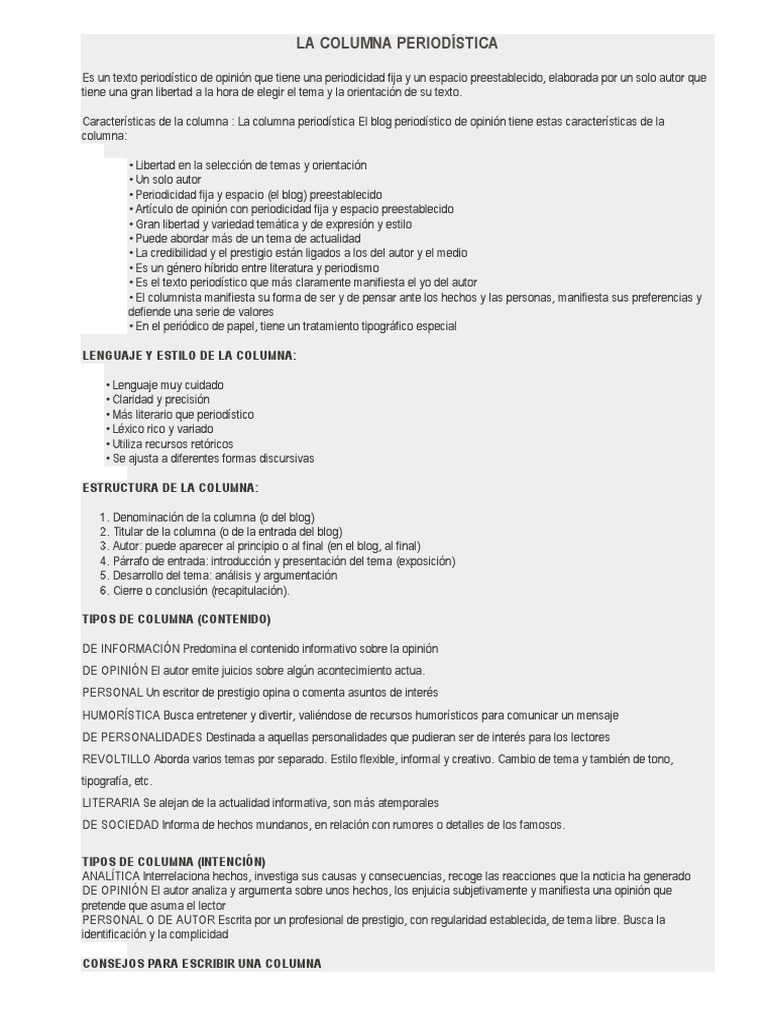 Ellas pueden expresar puntos de vista de los columnistas de una manera mordaz y humorística y por lo general tratan de persuadir a. Y aqui esta un resumen de mi investigacion. No dejes de visitarlos pues en ellos encontrará. 514 Clases de crónica. Universidad del Valle de Orizaba Plantel Córdoba Licenciatura en Ciencias de la Comunicación Materia. La columna periodística o también conocida como artículo de opinión es un texto subjetivo en el que se aborda algún tema de actualidad según el pensamiento particular de su autor.