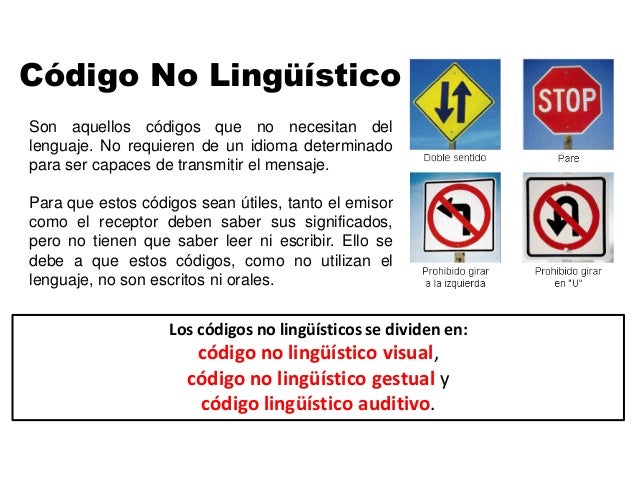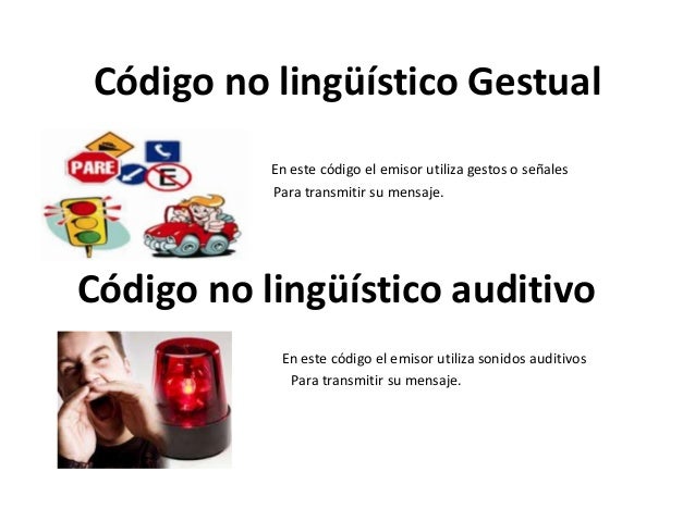 Se transmite a través de la vista. Para captar el mensaje el receptor debe ver la señal que el emisor le envía. Ejemplos de Códigos No Lingüísticos Auditivos. Para captar el mensaje el receptor debe ver la señal que el emisor le envía. En el código no lingüístico auditivo la señal es más universal y no. Los códigos no linguísticos se dividen en código no lingüístico visual código no lingüístico gestual y código lingüístico auditivo.