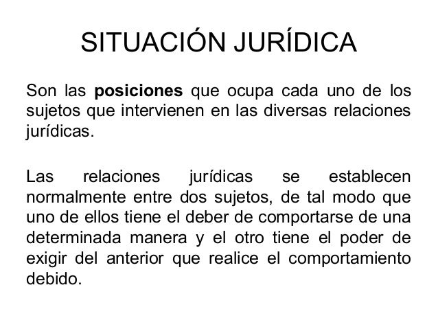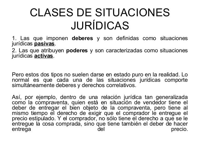 Podría decirse que las situaciones jurídicas son las posiciones que ocupa cada uno de los sujetos que intervienen en las diversas relaciones jurídicas. Sin embargo existen otros que sí son importantes para el derecho porque su realización además de producir resultados materiales genera consecuencias jurídicas por afectar situaciones que el derecho protege o regula. Las que imponen deberes y son definidas como situaciones jurídicas pasivas. Es decir el ordenamiento jurídico va a determinar cuál es el interés que será favorecido entre los sujetos de una determinada relación jurídica. 10 Ejemplos de Normas Jurídicas. Esas situaciones han sido explicadas por la doctrina con diversas teorías.