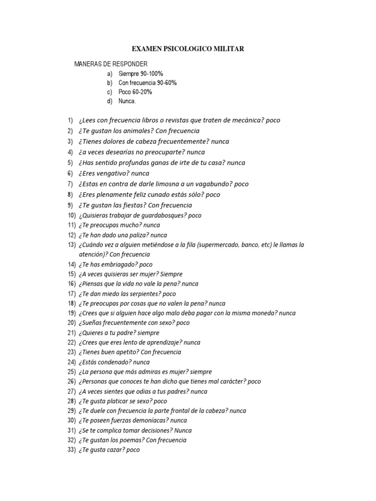 Pruebas Psicológicas Simulador Gratis Psicométricas Preguntas Respuestas Test Cuestionario. En primer lugar lo mejor es que veas un examen psicologico militar de ejemplo esto te dará una idea de lo que debes estudiar antes de tomarlo. Para cada situación hay una sola respuesta. 84 307 84 encontró este documento útil 307 votos 202K vistas 4 páginas. De acuerdo con el comandante de la 34 Zona Militar Miguel Ángel Huerta Ceballos el 60 de quienes han hecho los exámenes para ingresar a la Guardia Nacional han reprobado el test psicológico el cual considera es el más importante de los tres que se hacen que incluyen además al físico y el médico. Cada una de estas pruebas tienen carácter excluyente por lo que es necesario pasar por todas con éxito para tener la oportunidad de hacer las pruebas selectivas el examen psicologico militar.